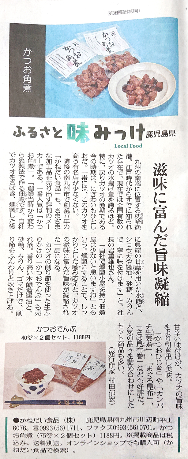 8月24日の東京新聞・中日新聞 サンデー版の 「ふるさと味みっけ」というコーナーで 旅行作家の村田郁宏さんに「かつお角煮」の記事を書いていただきました。